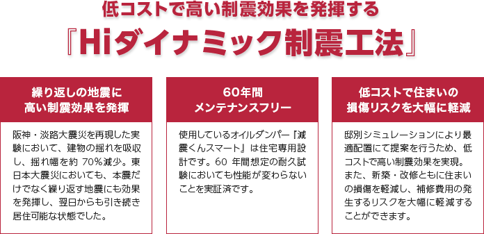 ビル用制震オイルダンパーで培った制震技術と、自動車用ショックアブソーバーの量産技術を応用した住宅用制震工法が『Hiダイナミック制震工法』です。大地震時の建物の変形を吸収することで、柱・梁・壁等の負担を軽減。特に余震を伴う繰り返しの揺れに効果を発揮します。『Hiダイナミック制震工法』は、新築時はもちろん既存住宅のリフォームにおいても設置可能な施工性に優れた画期的な工法です。